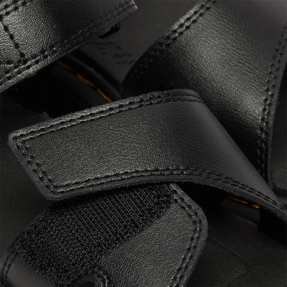 A mini revamp of Dr. Martens Voss II sandals, the Vossie Lampers are crafted from black leather with crisscrossed straps. Fastening with Velcro® straps, the pair rest upon a chunky, yellow-stitched sole for signature attitude.