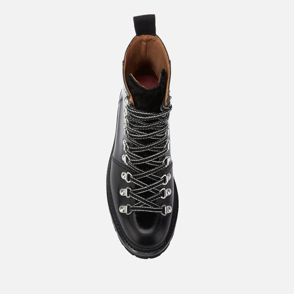 Grenson chunky hiker style boots with black grained calf leather uppers. The ‘Nanette’ boots are built on Grenson’s 631 last and detailed with striking cross over lacing, silver-tone D-ring eyelets and a black shearling apron and tongue. The boots sit on a chunky yet lightweight black commando sole for a rugged look. A heel pull loop and smooth leather lining complete the design.