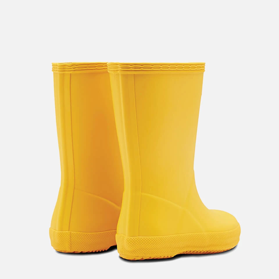 Bright yellow Hunter wellies designed for little feet. Fully waterproof, the wellington boots are handcrafted from natural rubber with a flat sole and a rounded toe to give feet room to move. Lined with soft cotton for comfort.