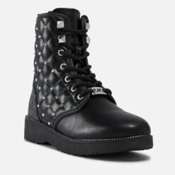 - Heel pull tabs, heel brand tag, silver-tone studs, quilted upper, stud lace hooks, moniker-printed heel, brand lace tag