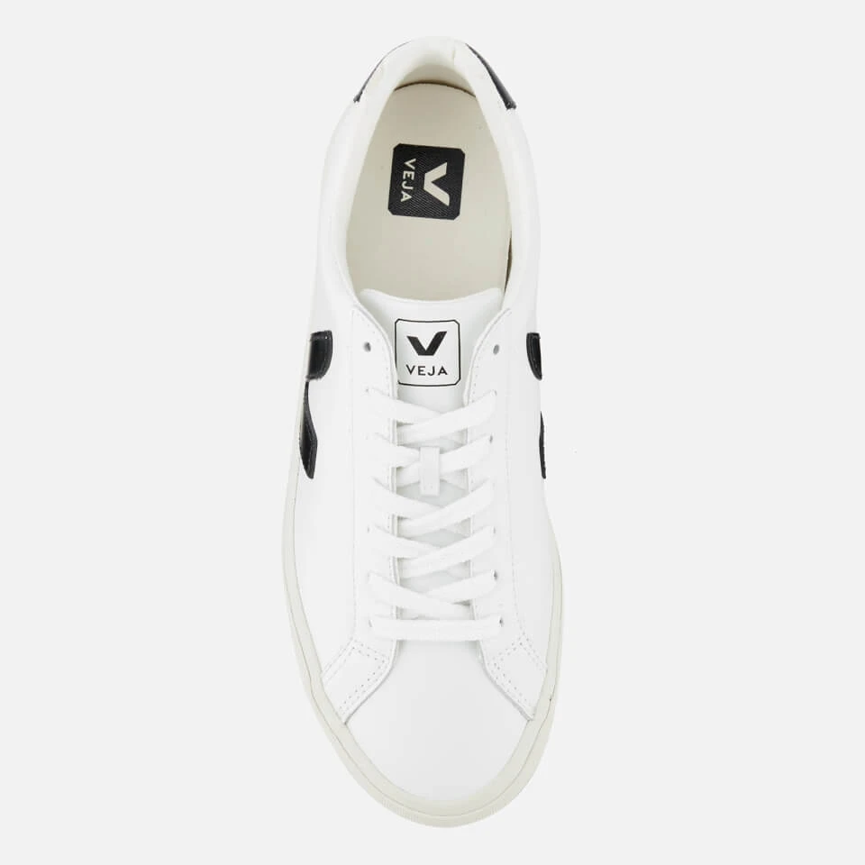 Men’s ‘Esplar’ low-top trainers from Veja. Crafted with smooth white leather, the sneakers comprise a tonal lace-up fastening, a black heel patch and a black rubberised ‘V’ logo to the side.