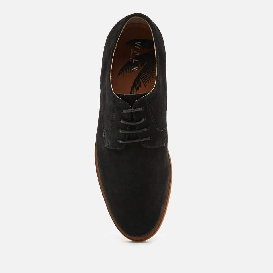 Walk London ‘Danny’ derby shoes in black suede. Rounded toe. Four eyelet lace-up fasten. Tonal stitching. Contrasting gum sole. Quarter lined inside with cushioned sock liner. Stacked heel.